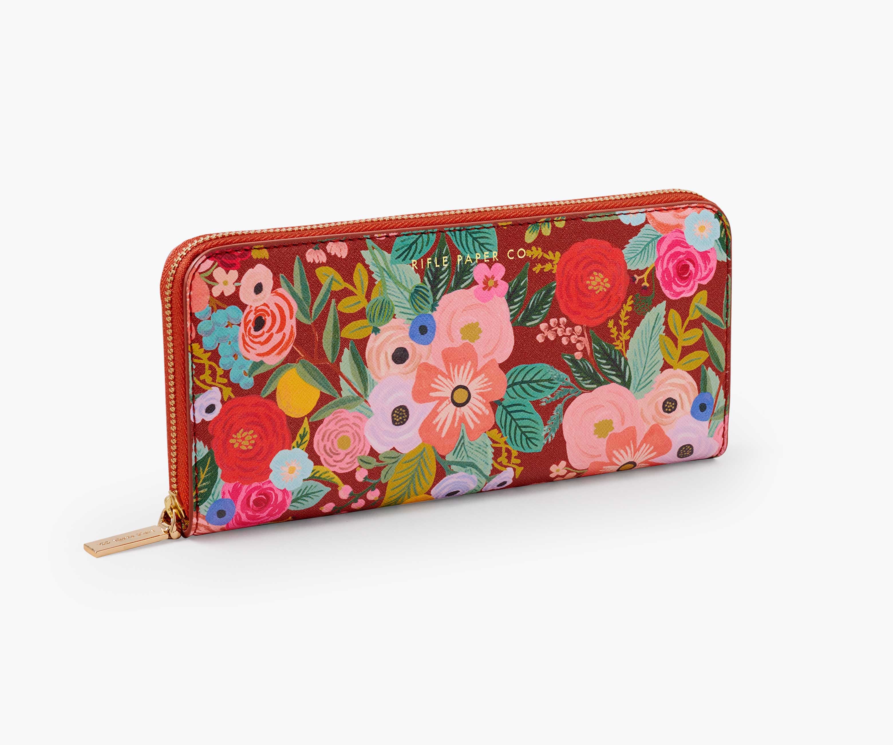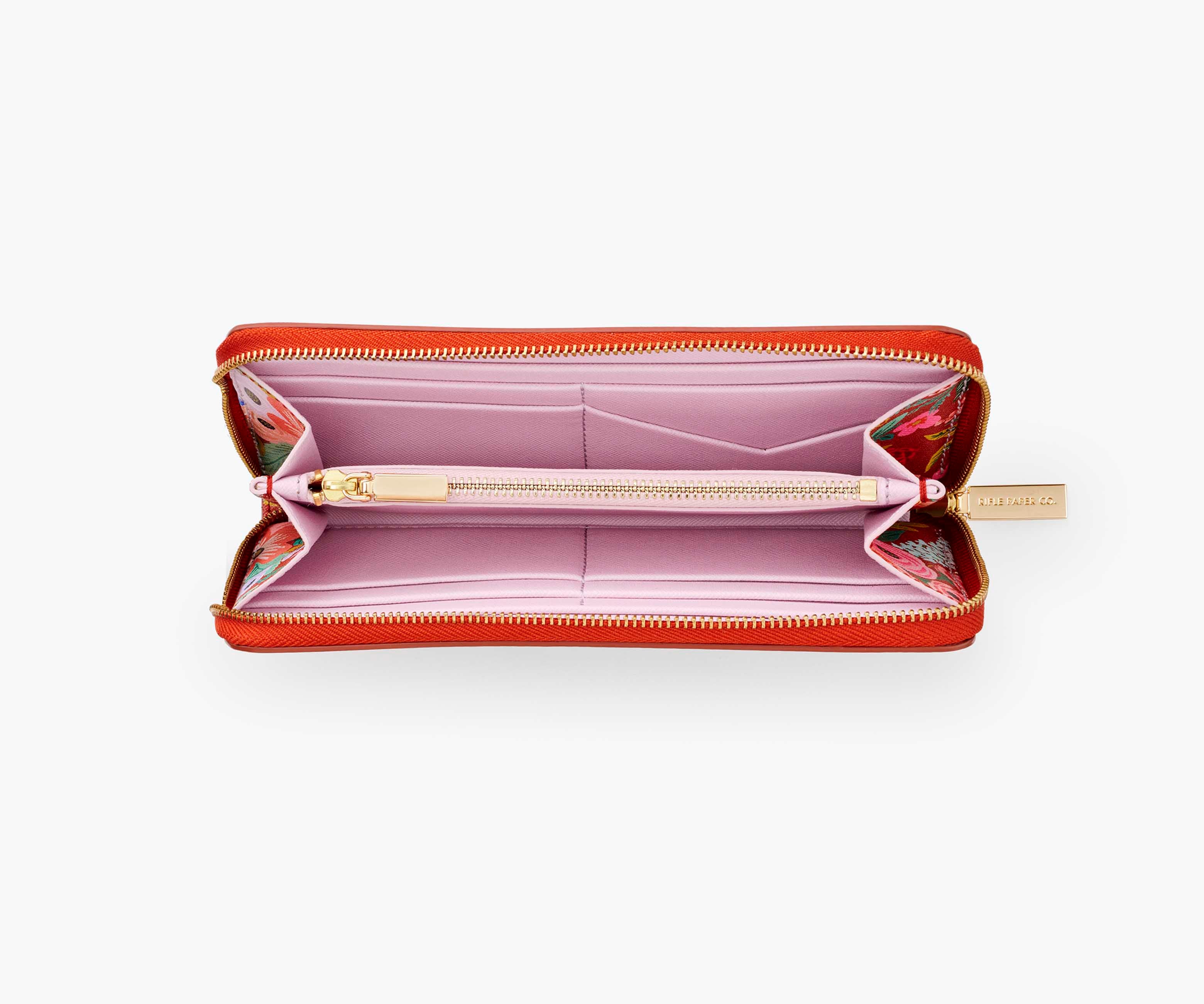 With a classic shape and our signature florals, our Garden Party continental wallet has room for all your essentials. The violet interior has eight card slots, two slip pockets and a zipper compartment for spare change. Brass zippers and pulls add the perfect finishing touch.