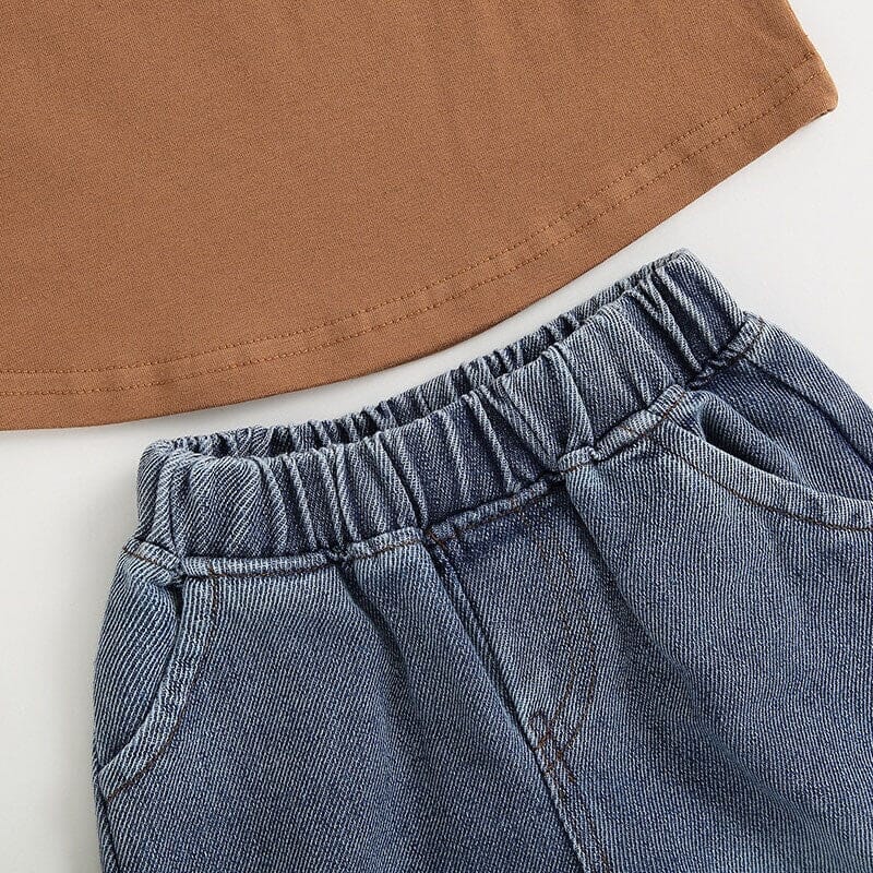 Dress your little adventurer in this stylish toddler boy outfit, featuring a brown solid tee and a pair of trendy jeans. The brown tee is versatile and pairs well with any bottoms, while the solid color adds a touch of simplicity and elegance. The stylish jeans are designed with comfort and style in mind, featuring a classic denim look with a modern twist.