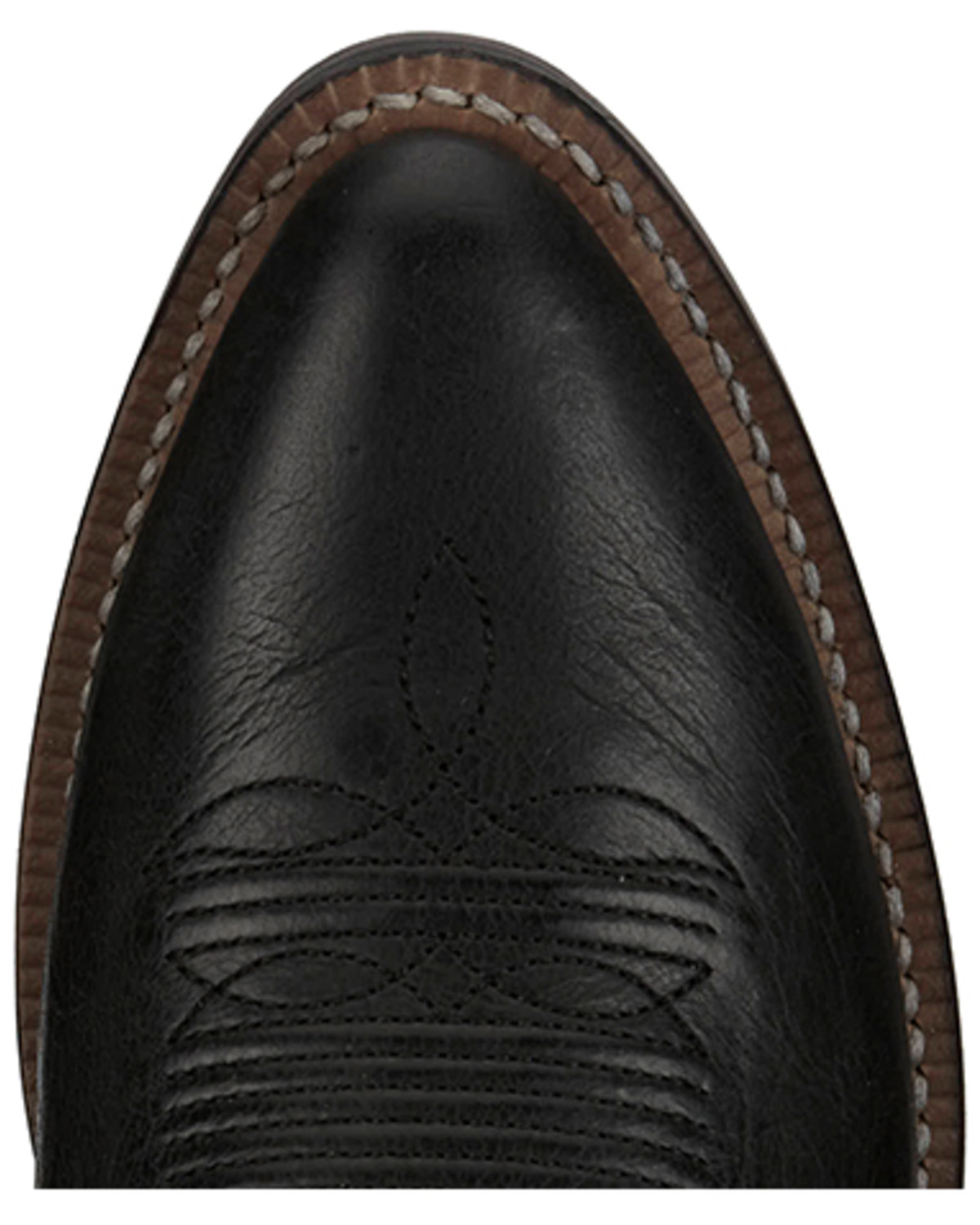 Leather upper, Leather outsole with rubber heel cap, Pull-on style with pull tabs, Snip toe, Western heel, 15" shaft height, Single-stitch welt construction, Solid black design with western stitching, Imported, J-Flex Comfort System insole for all-day and all-night comfort,